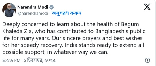 "Deeply concerned to learn about the health of Begum Khaleda Zia, who has contributed to Bangladesh’s public life for many years," Modi said in a message through his verified X handle.